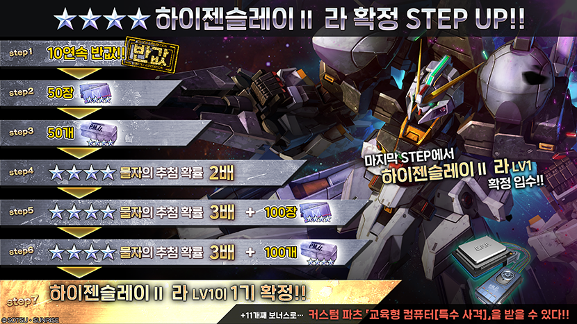 - ※STEP7의 10연 추첨 배급 중 1회는 「하이젠슬레이Ⅱ 라 LV1」이 확정 출현합니다.