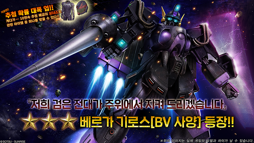 희소도 희소도별 제공 퍼센티지 희소도에 포함되는 아이템 종류 ★★★ 100.0000000% 1종류 베르가 기로스[BV 사양]LV2 가 1기 확정(10연속 중 1회)