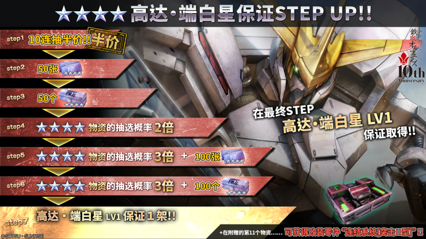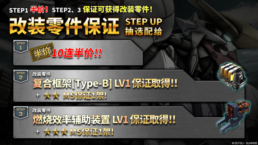 - ・STEP1(15枚代币):精选的4架强力机体中保证抽到1架&10连半价!