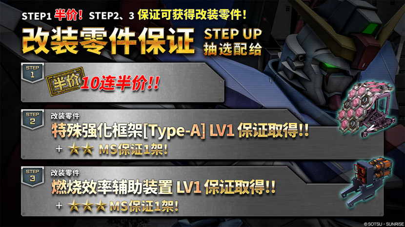 - ・STEP1(15枚代币):精选的4架强力机体中保证抽到1架&10连半价!