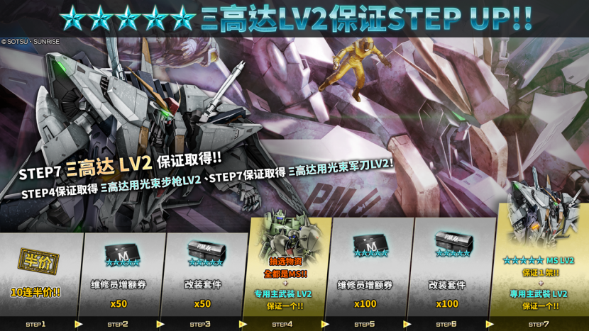 - ・STEP7 (30枚代币):必定获得一架Ξ高达 LV2!+第11个物资必定获得Ξ高达用光束军刀 LV2!