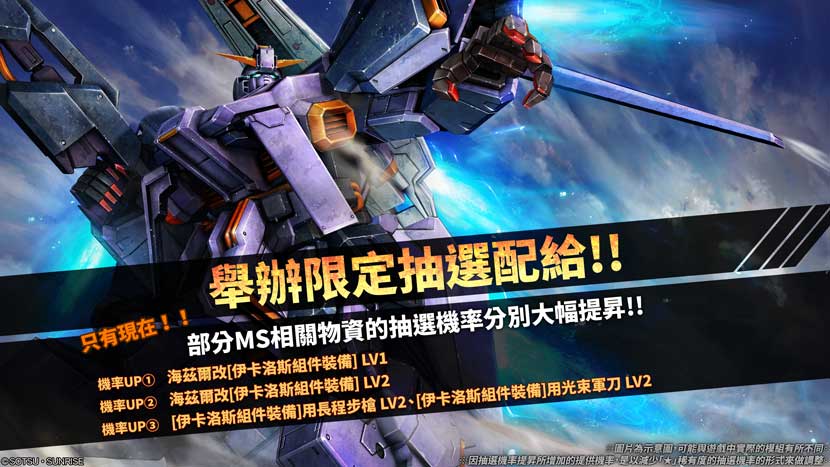 上圖新MS已更新至遊戲中,新抽選配給一覽請見下方列表。